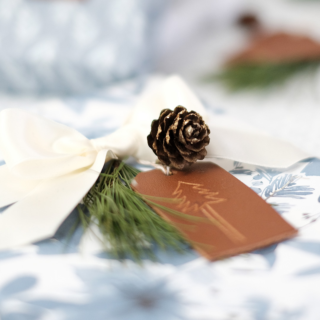 Meine fertigen Lederetiketten habe ich einfach mit Zapfen und etwas Fichte an die Geschenke gebunden. Dazu eine weiße Schleife und blaues Geschenkpapier. Schon ist die Geschenkverpackung fertig Und jetzt zeige ich euch, wie einfach es ist, Leder zu gravieren.